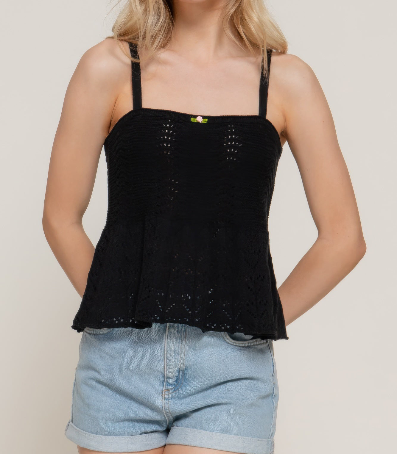 This sweater stands out with its delicate pointelle knit and beautiful flower trim detail, making it a standout piece for spring. The black color adds versatility, while the lightweight fabric ensures comfort throughout the day.