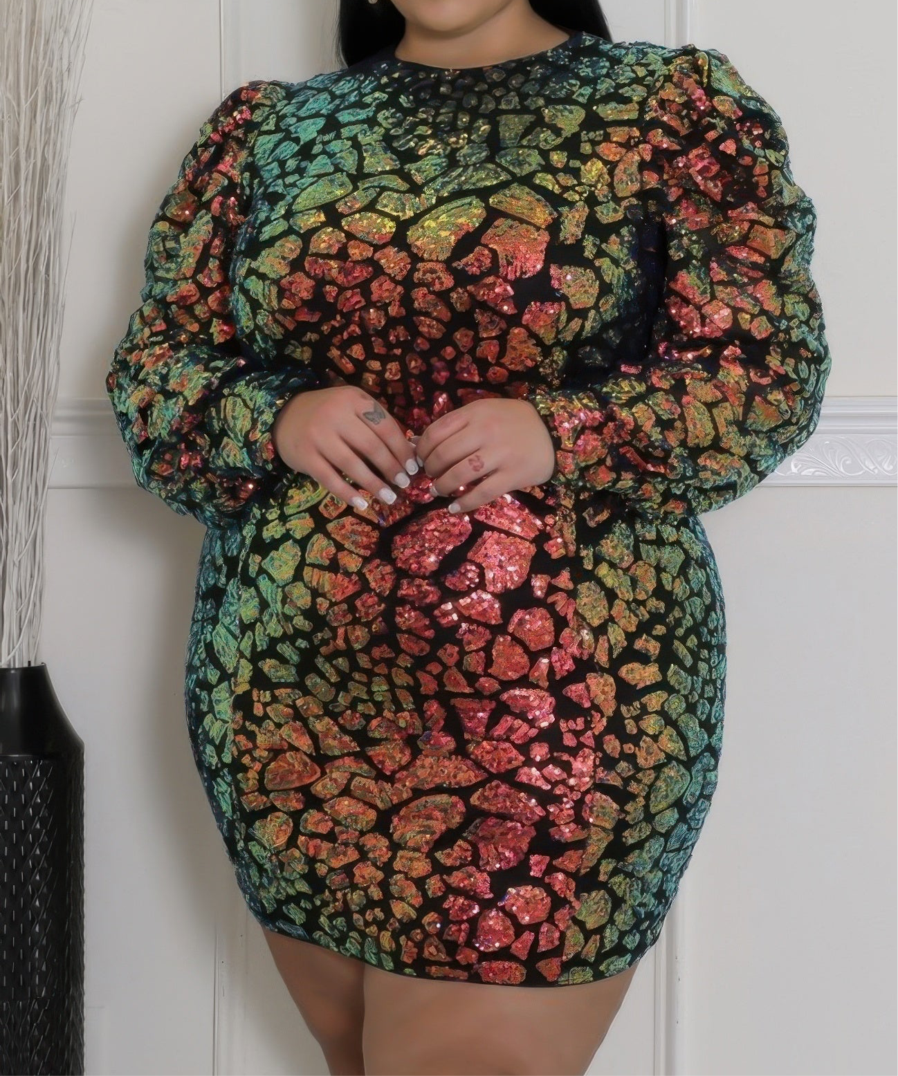 Design: Featuring a round neckline and long sleeves, this dress is adorned with shimmering sequins throughout. The zipper closure at the back ensures a secure fit. The multi-colored sequin design adds a fun, festive element, making it perfect for glamorous occasions.