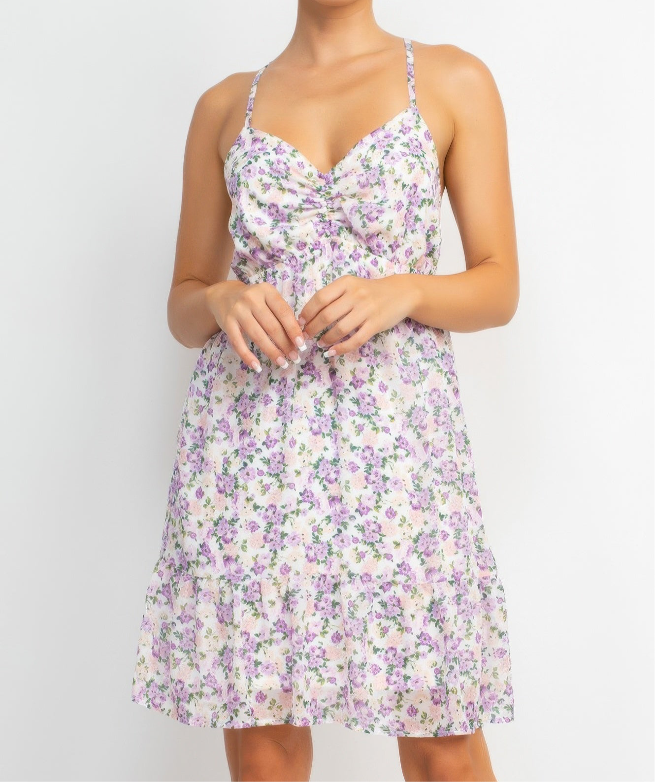 Bring a fresh and feminine touch to your wardrobe with our Double Strap Back Mini Dress. This woven floral print dress features a sweetheart neckline, flattering ruched details at the front, and an elastic waist for the perfect fit. The double strap design on the back adds a trendy twist, making this dress ideal for any occasion.