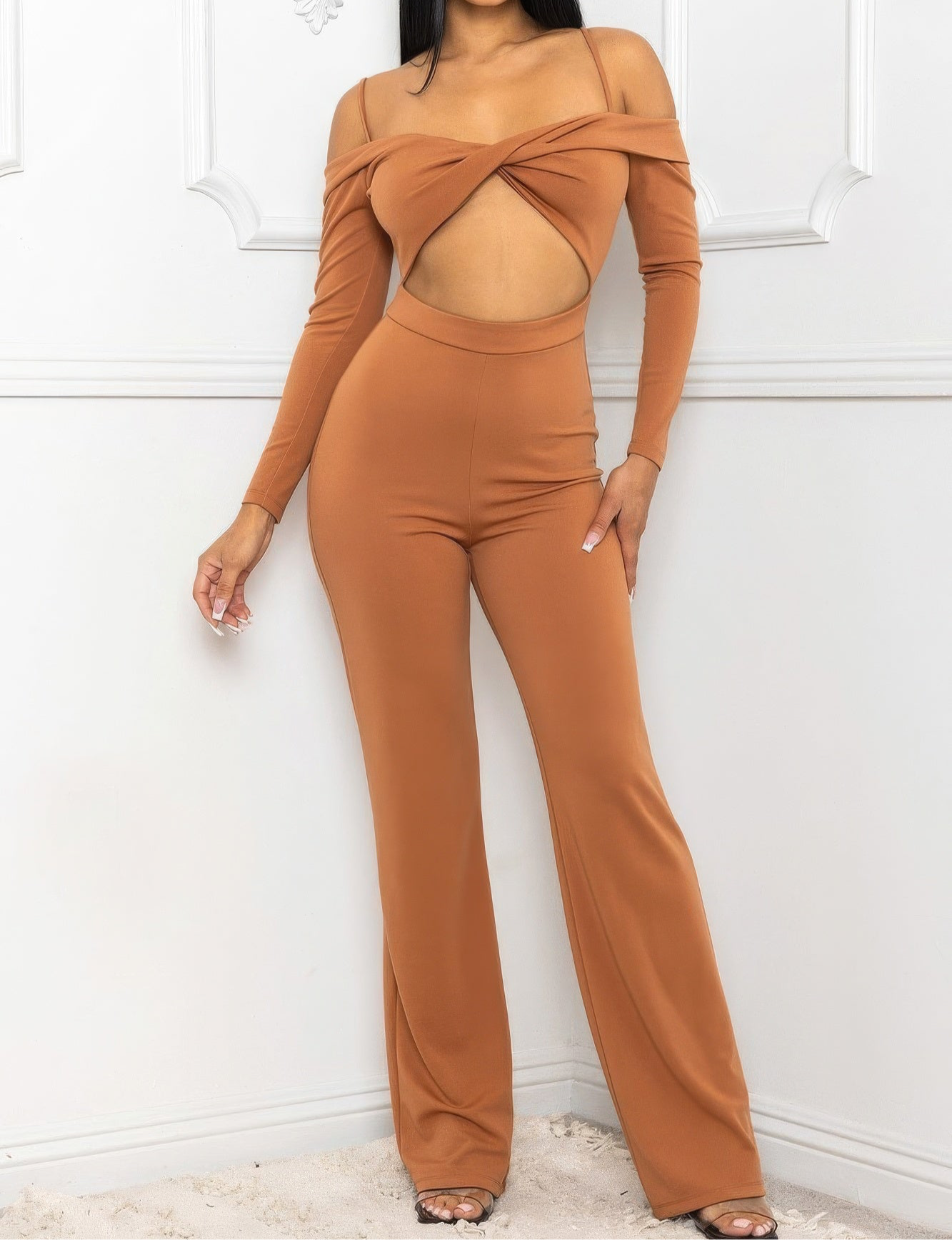 Elevate your style with our Open Shoulder Cutout Detail Jumpsuit in cinnamon. Add it to your cart now and experience the perfect blend of fashion and comfort!