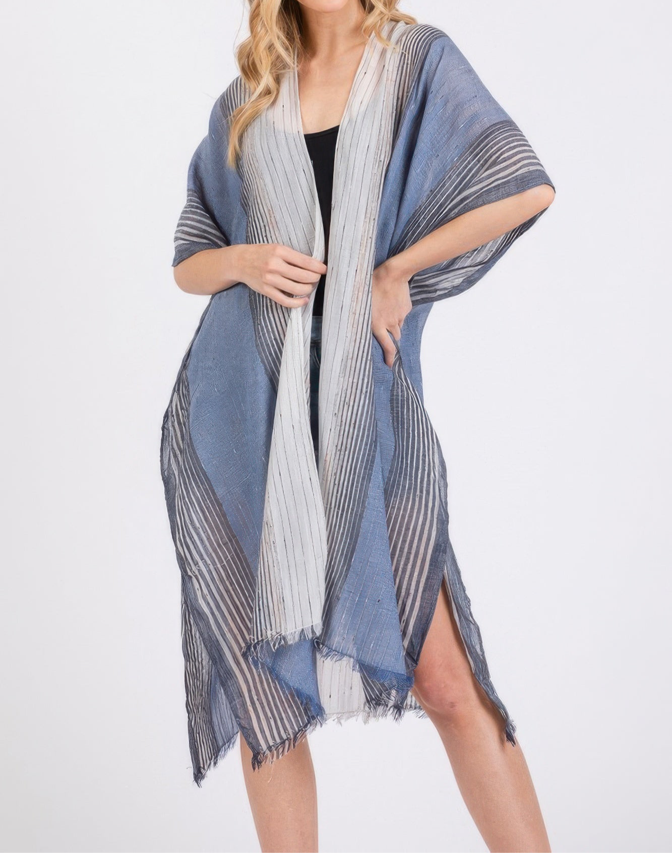 Wrap yourself in the effortless charm of the Striped Two Tone Cover Up Kimono. This breezy, lightweight piece features a soft drape and elegant striped design that transitions seamlessly from beachside to city strolls. Its flowing silhouette flatters every figure, offering versatile styling over swimsuits, dresses, or casual looks. The two-tone palette adds a contemporary twist, making it an easy choice for those who love refined style with a relaxed edge.